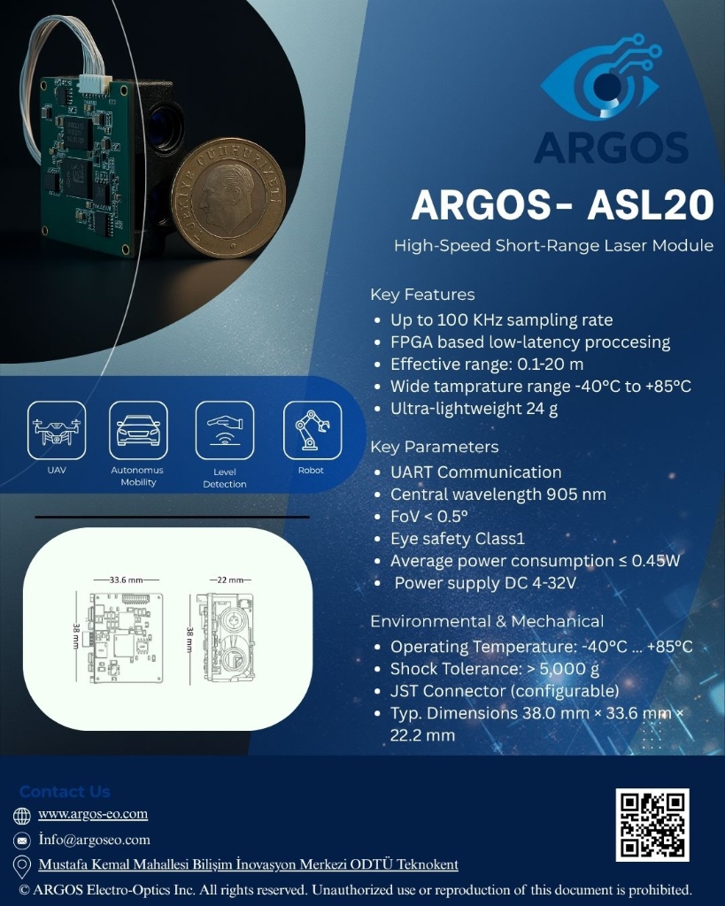ARGOS ASL-20, yüksek hızlı kısa menzilli lazer mesafe ölçüm modülüdür. 100 KHz'e varan örnekleme hızı, FPGA tabanlı düşük gecikmeli işleme ve ultra kompakt tasarımı ile İHA, otonom araç ve robotik sistemler için ideal çözüm sunar.