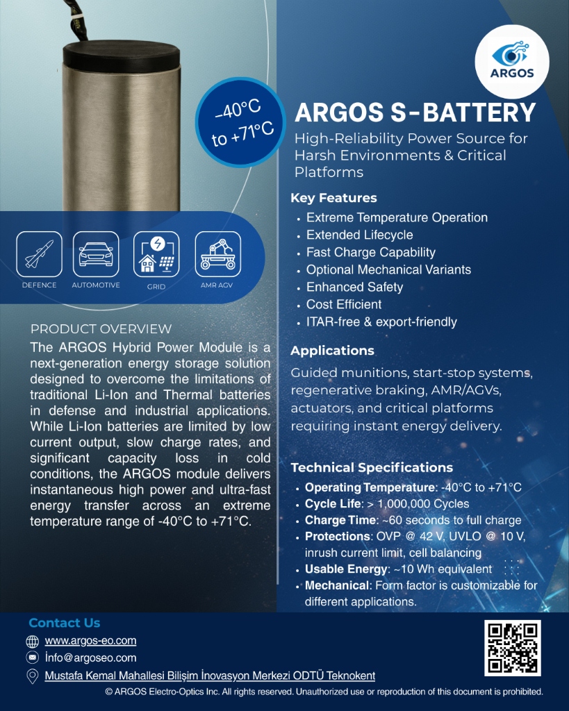 ARGOS Hibrit Güç Modülü, savunma ve endüstriyel uygulamalarda geleneksel Li-Ion ve Termal bataryaların sınırlamalarını aşmak için tasarlanmış yeni nesil bir enerji depolama çözümüdür. -40°C ile +71°C arasında anlık yüksek güç ve ultra hızlı enerji transferi sağlar.
